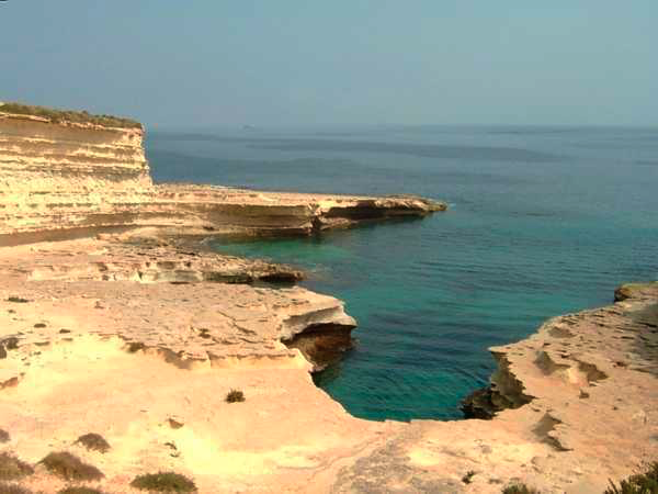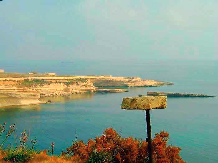 Slug Bay, not a very pretty name, is without sand and, like most of the bays between Delimara Point and Marsascala, has been formed by the sea crashing against the limestone cliffs, which makes this part of the Maltese Coast so rugged and interesting. From this bay we took the path north with the beautiful clear blue sea on our right. We are always amazed how clear the sea is around Malta, which makes it very much a mecca for underwater exploration.