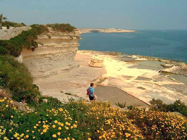 Having passed Peter’s Pool we reached Il-Hofra-z-Zghira, and took the opportunity to leave our cliff top path and go down to sea level. Here there are massive flat rocks, ideal for sunbathing, and it is undoubtedly a wonderful sun trap, although because of its isolation it is unlikely to get overcrowded. We explored this “lido” and admired the “arch” in the headland called Ras il-Fenek located to the northside of this bay. Unfortunately, unless we wanted to do some dare devil rock climbing there is no way from this area other than by the way we came, so we turned around and within a few minutes we had ascended the steps, adjacent to a very well located house, and rejoined the cliff top path.