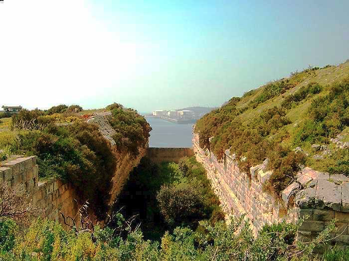 The moat at Fort Delimara, with Marsaklokk Bay and some of its industrialization in the distance.