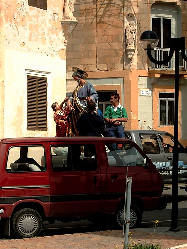 After about a ¼ mile, at a traffic island, we turned sharp left and soon were walking down a narrow street with the imposing church, at the end of Kalkara Creek, showing itself on the skyline ahead of us. Part the way down this street we came to an area on our right, like a large balcony, which gave us good views of Kalkara Creek. We also watched some local youths struggling to keep a slightly larger than life-size model of Jesus upright on the back of a pickup vehicle. A little bit of local colour.