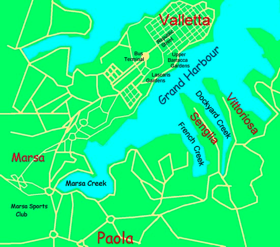 As stated on the link to this page, it may have been considered that taking "the boat" across the Grand Harbour to get to Valletta from Vittoriosa was a "bit of a cheat", so on this latest excursion to Malta it was decided that we should walk between the two locations. So having caught the bus from Marsascala, where we were staying, we arrived at Vittoriosa at about 11 o'clock on a glorious sunny morning.Map of area between