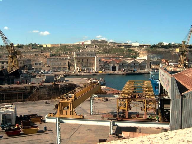 Reaching the southern side of Senglia, we turned right (north) as if we were going to go to the end of the peninsular on which it is situated, but then we immediately went left and ascended a steep street/road. At the top of this rise we were able to look down on our right to the industrial area around French Creek. This was very much a contrast to Dockyard Creek with cranes and engineering rather than the expensive boats we had seen earlier.