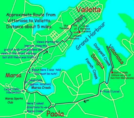 Would I do this walk again? Probably not and certainly if I asked Anne to do it again I know what the answer would be. Although looking at a different map to the one I used on the walk - this one has more detail of the approach into Valletta - it would seem that we should have been able to get to a road that skirted the Grand Harbour and taken us away from the noise and traffic of our route. Still it was an "unforgettable" experience.